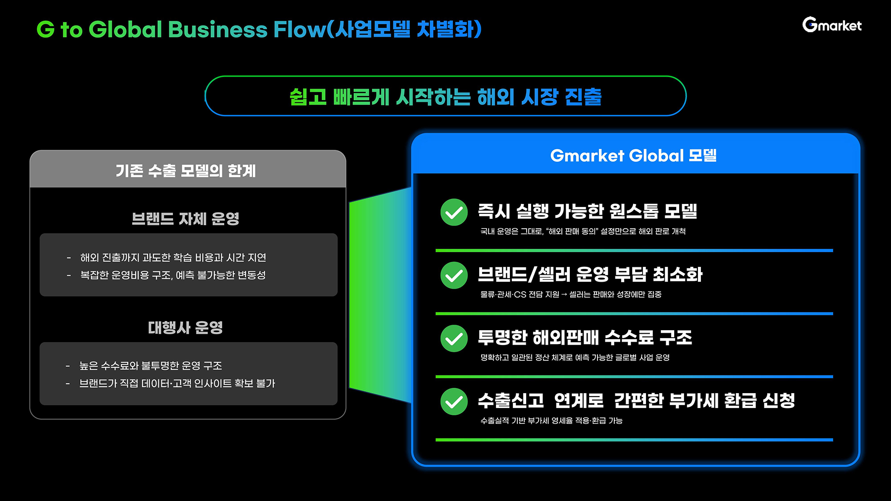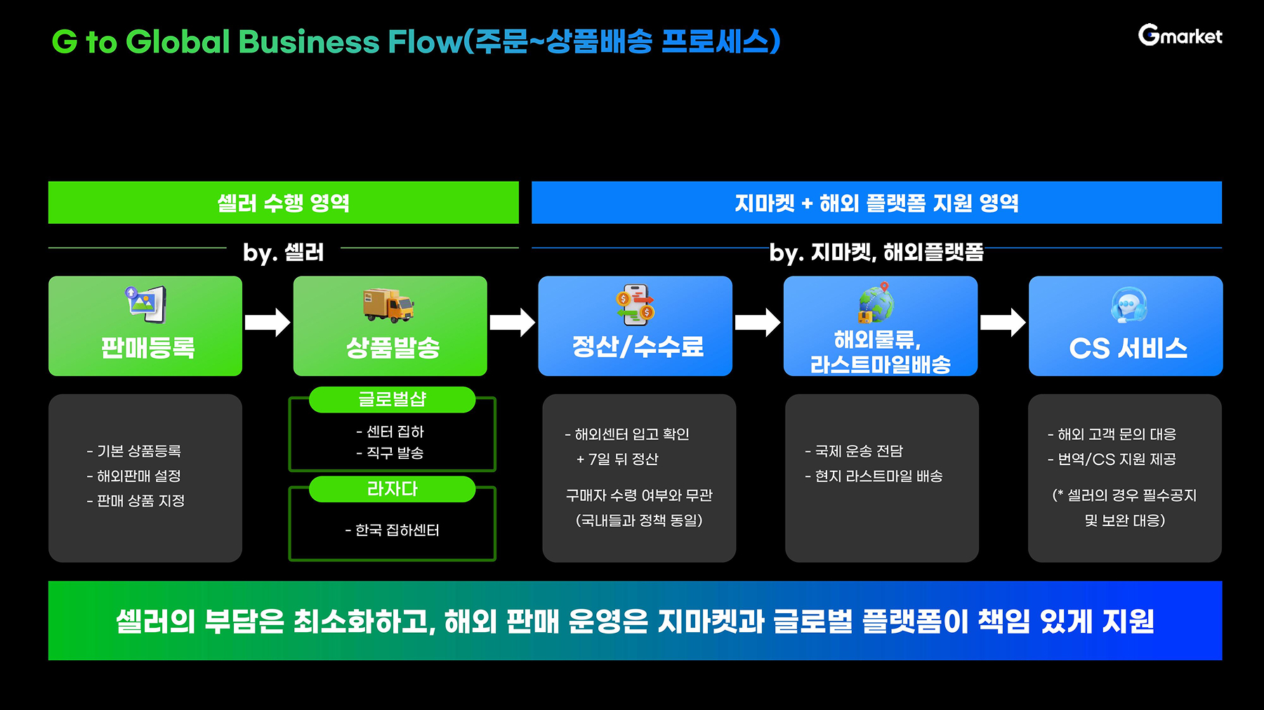 G마켓은 국내 판매자들의 해외 진출을 적극적으로 지원합니다.